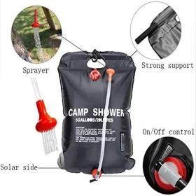 حقيبة دش المخيم المحمولة: يعتبر دش المخيم المحمول الجديد في الهواء الطلق الرفيق المثالي لأي معسكر تم إنشاؤه. محمولة بسهولة وسريعة الإعداد وسعة كبيرة تعني أنه يمكنك الاستحمام الدافئ كل يوم أثناء التخييم في الهواء الطلق. ما عليك سوى ملء الماء ، والتعليق من شجرة ، أو غيرها من منصات الدعم تحت أشعة الشمس الكاملة ، والاستمتاع بدش دافئ كل يوم.