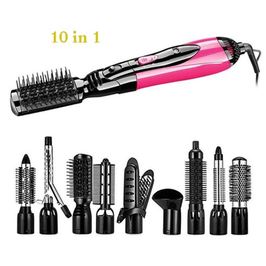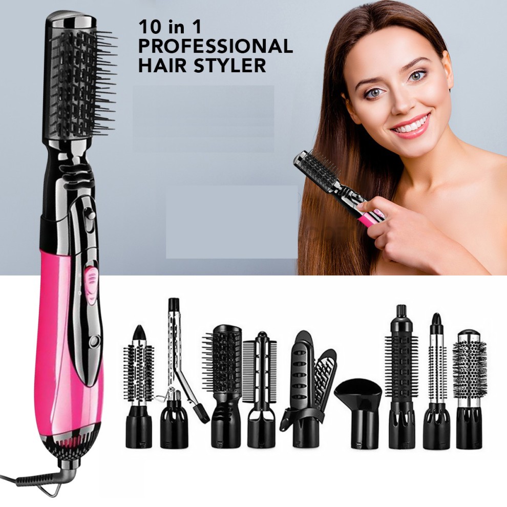 9 attachments Comb - to add volume from the roots. Smoothing brush attachment, Round brush attachments for large and small curls. Curling attachments.