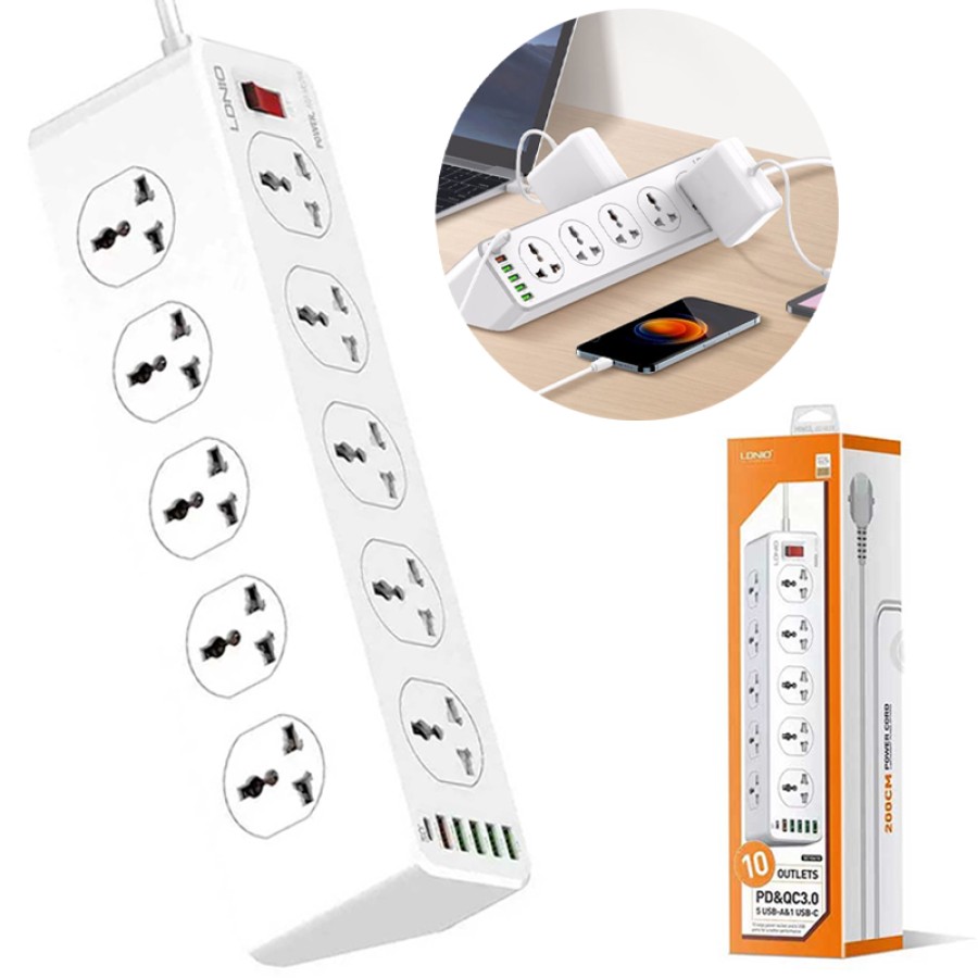 LDNIO 10 outlets socket 6 USB ports fast charger PD & QC3.0 and Heavy-Duty Power extensions 2500w with Cord 2 meter, heavy-duty power cord. Helps ensure optimal power flow to connected devices and 16 devices can be charged at the same time. Smooth, elegant, and Unique design and every thoughtful detail provide the best experience for you.