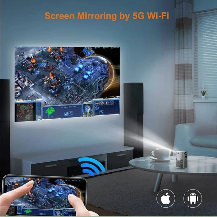 5G WiFi / Bluetooth 5.0 Function: Equipped with the latest ultra-fast 5G WIFI function and wireless mirroring function that allows you to wirelessly project videos and images from your smartphone, tablet, or laptop by simply connecting it to the same wifi. Equipped with a two-way Bluetooth 5.0 function, you can connect external speakers, earphones, headphones, and more when you watch movies on your projector.