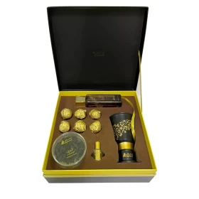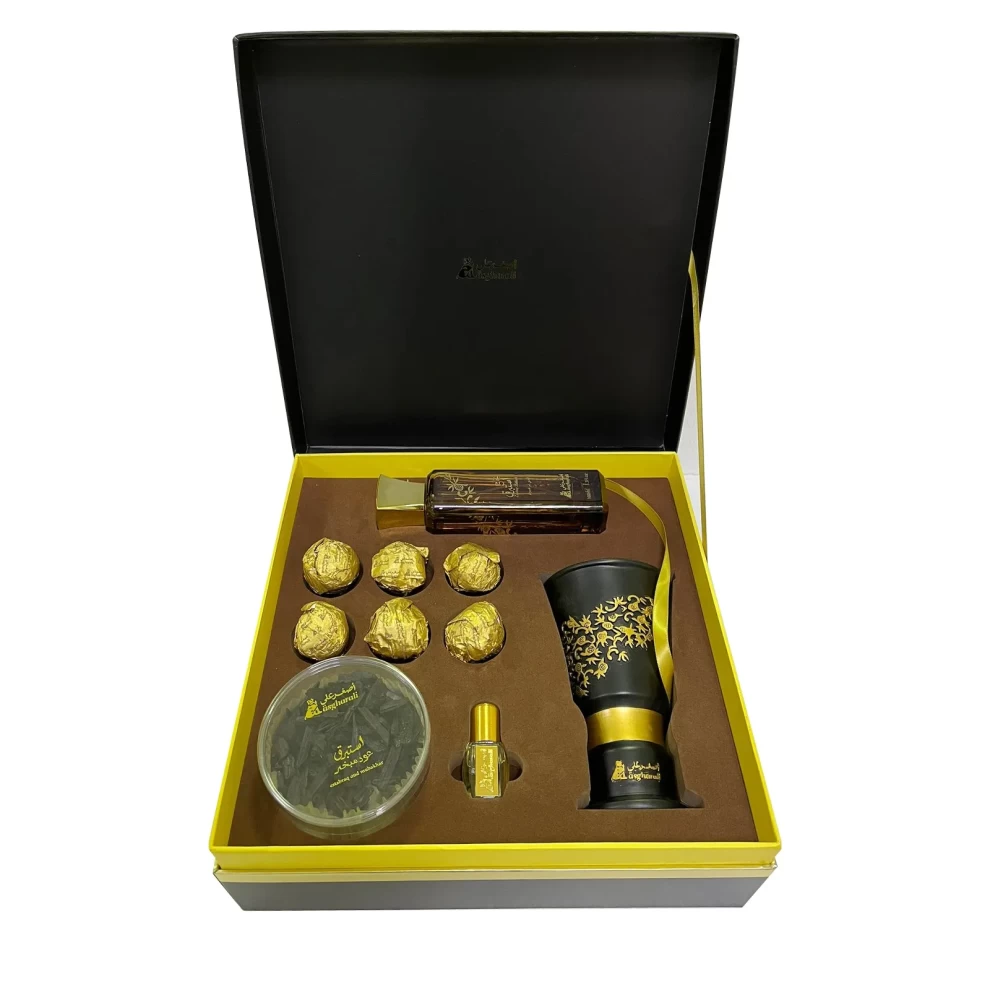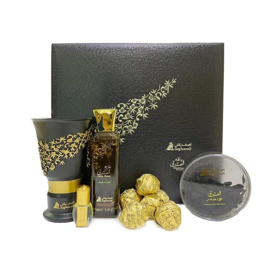 ‘Estabraq’ is the well-known fragrance collection of Asgharali with its pure and sophisticated scent that speaks to the senses of simplistic elegance of spicy fougere and ambery frangrance. Estabraq bouquet set contains 110grms of Bakhoor, 100 ml spray, 3ml attar oil and 30grms oud mubakhar, making it a wonderful, complete all-in-one collection, perfectly combined for gift giving or for sharing with the whole family.