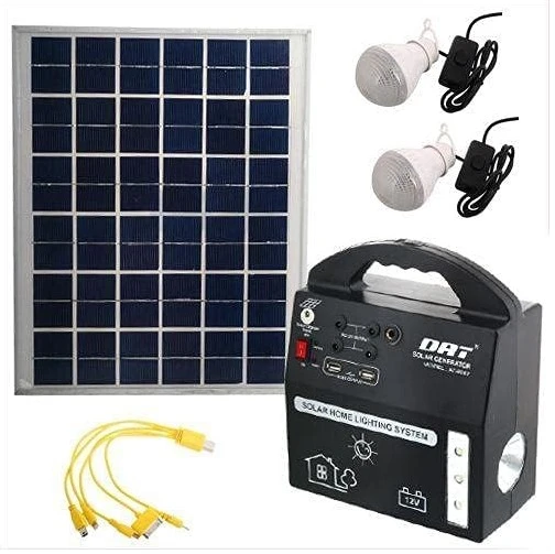 DAT solar lighting system - simple and easy to operate. The solar lighting system features an automatic light controller with adjustable run time and over-current protection. Long lasting battery, suitable for home use, camping or emergency situations. Long Working Time With two lights together for 20-25 hours, this solar panel works for a long time.