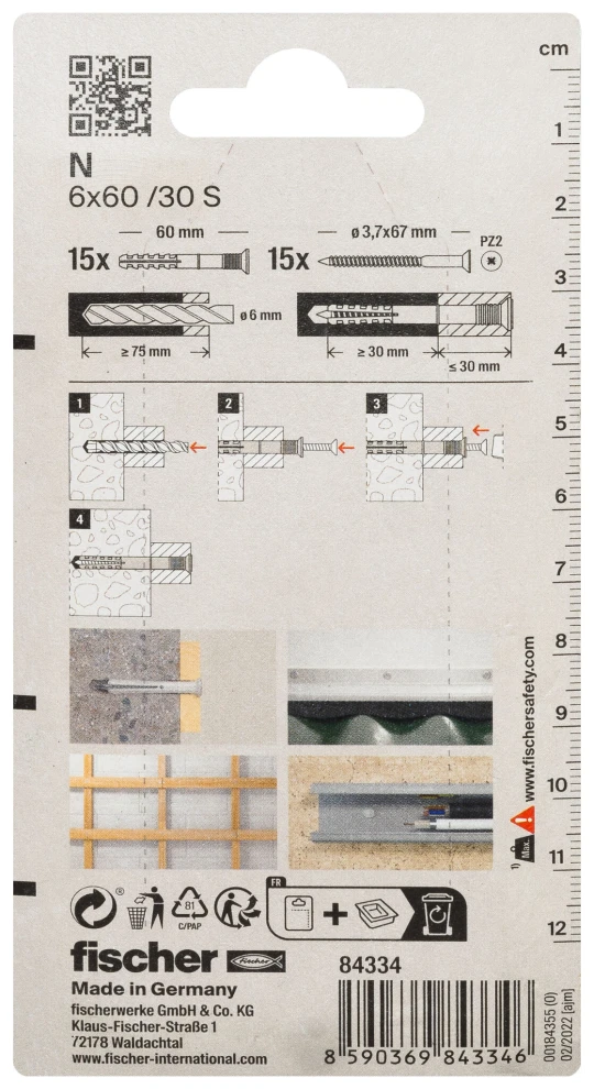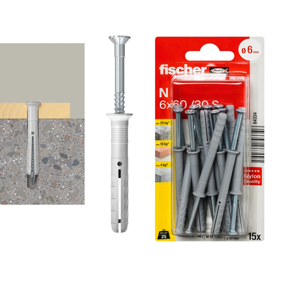 Fischer N 6 x 60/30 S K NV Plug with counter sunk screw 15pcs